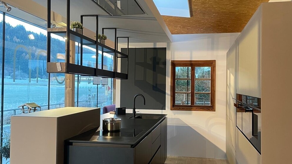 Der Dunstabzug ist als vollintegrierte Deckenhaube mit leistungsstarker Abluftfunktion ausgeführt und lässt sich komfortabel direkt vom Kochfeld aus steuern. Alternativ kann selbstverständlich auch eine Umluftlösung umgesetzt werden.