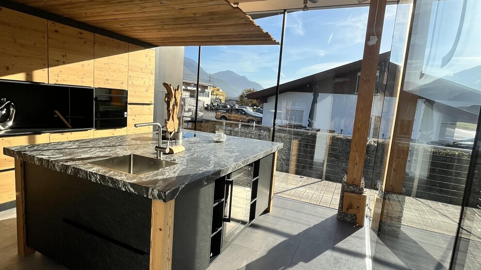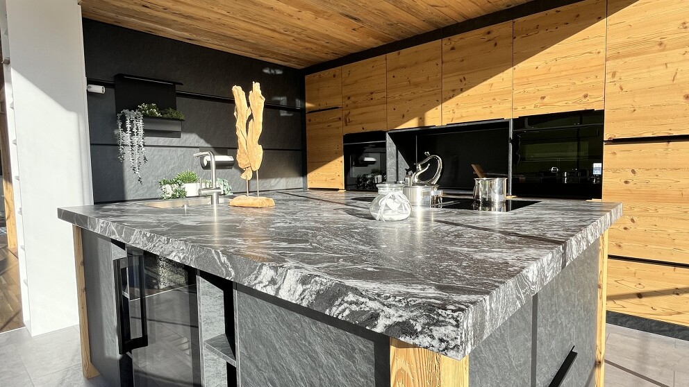 Diese Küche vereint moderne Technik, hochwertige Materialien und einzigartiges Design zu einem harmonischen Ganzen. Die massive Steinplatte setzt einen eleganten, langlebigen Akzent und bietet großzügigen Platz für alle Kochvorhaben.
